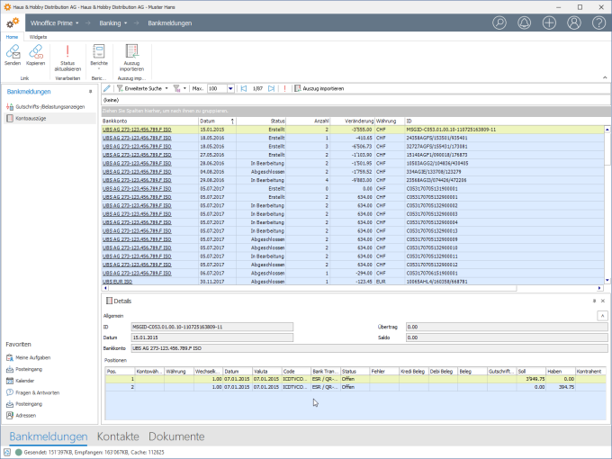 Mit jedem importierten Kontoauszug werden auch der Startsaldo/Saldovortrag vom Vortag, der Saldo aller Transaktionen sowie der Tages Schlusssaldo gemeldet und in der Kontoauszugszeile angezeigt.