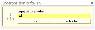Lagerposition aufteilen - Soll eine Lagerposition, deren Anzahl > 1 ist, auf mehrere Positionen aufgeteilt werden (z.B. um diese in verschiedenen Lagerplätzen einzulagern), so kann dies mit Hilfe der Aktion Lagerposition aufteilen erreicht werden. Nach markieren einer aufzuteilenden Lagerposition und Ausführen der Aktion wird ein Fenster angezeigt, in welchem die Anzahl eingetragen werden kann, welche die durch die Aktion erstellte neue Lagerposition erhalten soll.