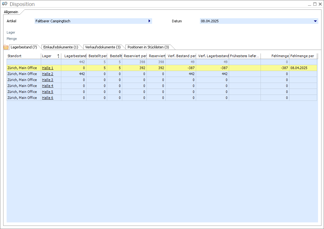 Sollte zum gewünschten Lieferdatum kein Bestand des Artikels verfügbar sein, so kann durch Änderung des Datums ermittelt werden, wann der benötigte Bestand verfügbar sein wird.