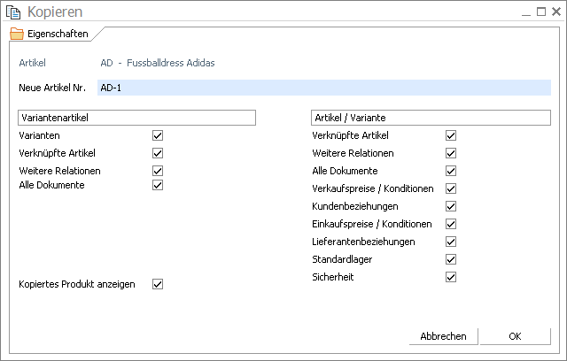Im Assistenten kann eine Neue Artikel Nr. eingetragen und es können mit Hilfe der Checkboxes jene Elemente ausgewählt werden, welche in aus dem Ursprungsobjekt in die Kopie übernommen werden sollen. Je nach Objekt sind dies Kunden- und Lieferantenrelationen, verknüpfte Artikel, Varianten, Dokumente oder Stücklistenelemente). Nach Bestätigung der Eingaben mit OK wird der Assistent geschlossen, die Kopie wird erstellt und, abhängig von der Eingabe in Kopiertes Produkt anzeigen, zur Bearbeitung geöffnet.