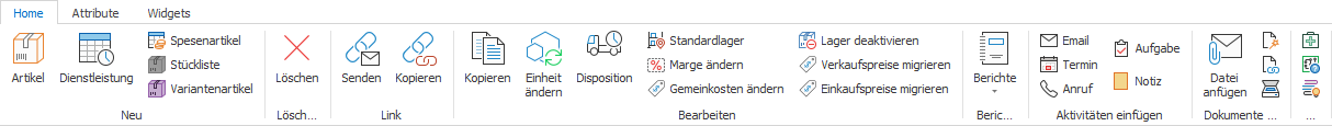 Hinweis Die Darstellung des Ribbon kann je nach Lizenz und Berechtigung des aktiven Anwenders von der hier gezeigten Darstellung abweichen. Auch kann es bei Nutzung von Winoffice Prime in Englisch, Französisch oder Italienisch zu Abweichungen von der oben gezeigten Reihenfolge der Symbole innerhalb der Gruppen kommen. |