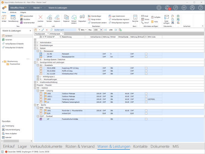 Die Ansicht Sortiment dient als zentraler Ort für die Verwaltung von Waren und Leistungen, welche beim Durchlaufen des Business Prozesses Handel beschafft, gelagert, verkauft, montiert, gerüstet oder versandt werden.