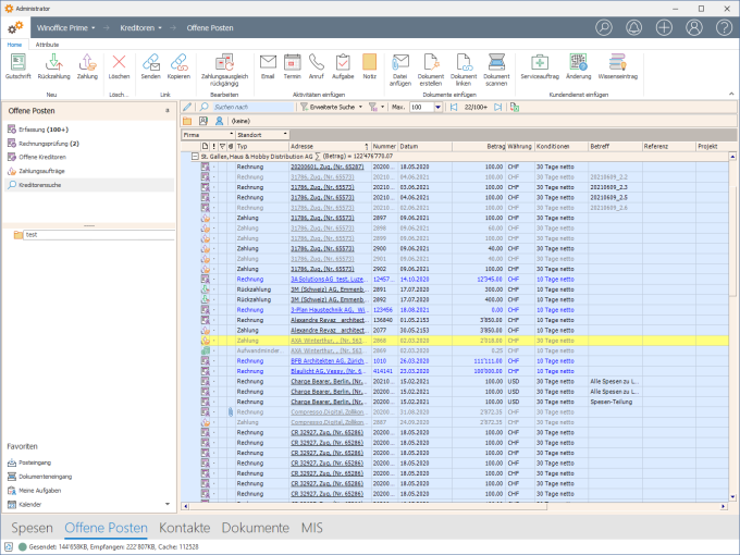 Der Ribbon für die Ansicht Kreditorensuche bietet den direkten Zugriff auf die Aktionen, welche für die in der Tabelle markierten Objekte ausgeführt werden können.