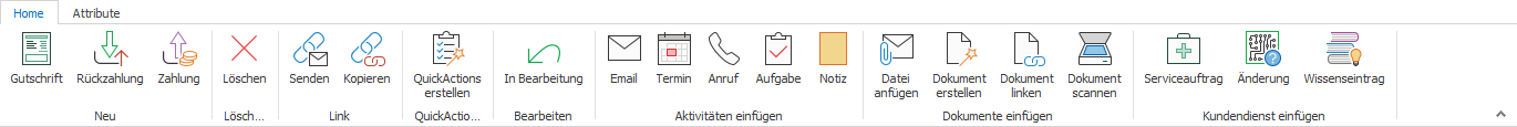Hinweis Die Darstellung des Ribbon kann je nach Lizenz und Berechtigung des aktiven Anwenders von der hier gezeigten Darstellung abweichen. Auch kann es bei Nutzung von Winoffice Prime in Englisch, Französisch oder Italienisch zu Abweichungen von der oben gezeigten Reihenfolge der Symbole innerhalb der Gruppen kommen. |