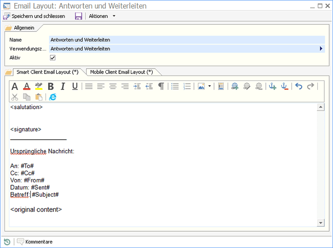 Als Layout für das Beantworten und Weiterleiten von Emails kann das obenstehende Beispiel verwendet werden. Der Teil unterhalb des Signaturplatzhalters bewirkt, dass die ursprüngliche Nachricht inklusive bestimmter Kopfinformationen in das Antworten-/Weiterleiten-Email übernommen wird.