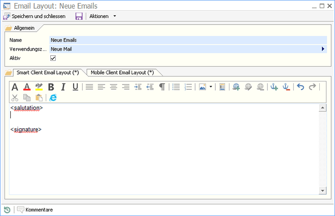 Das Layout für neue Emails soll wie oben gezeigt angelegt werden. Die beiden Einträge im Textfeld sind Platzhalter für die Positionierung der Anrede <salutation> und die Email Signatur <signature>. Die Platzhalter müssen genau so wie abgebildet verwendet werden. Die Zeilenabstände zwischen den beiden Platzhaltern können nach Bedarf frei gewählt werden.