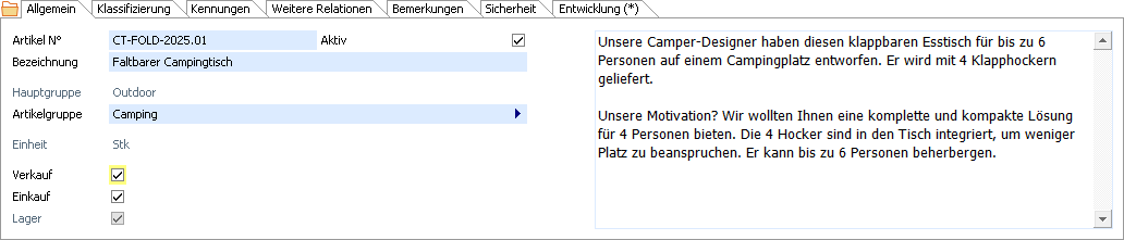 Dies ist ein Pflichtfeld, in welchem die Artikelbezeichung eingetragen wird. Diese Information wird für die Kurzbeschreibung des Artikels in Listen sowie in Verkaufs- und Einkaufsdokumentzeilen verwendet. |