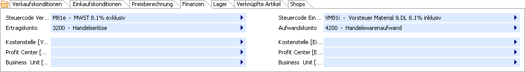 Das Register Finanzen dient zur Hauptsache der Zuweisung von Ertrags- und Aufwandskonten sowie den Steuercodes, welche bei der Verwendung des Artikels in Verkaufs- und Einkaufsdokumenten standardmässig automatisch eingesetzt werden sollen.