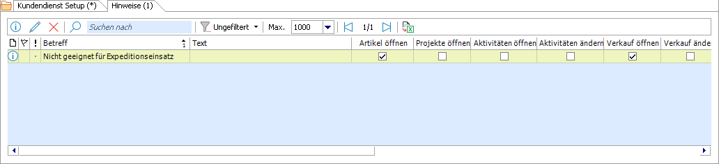 Im Subregister Hinweise können Benachrichtigungen eingerichtet werden, welche analog zu den Hinweisen für Adressen im vorgesehenen Zusammenhang angezeigt werden können. Die Hinweise selbst werden bei Eintreten der jeweiligen Regel in Form eines gelben Balkens am oberen Rand des Objektdetail Fensters eingeblendet.
