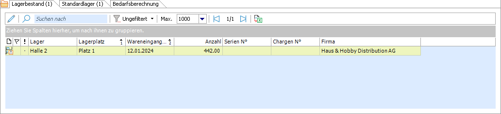 Das Subregister Lagerbestand informiert darüber, welcher Bestand des Artikels aktuell im Lager eingebucht ist. Die Tabelle weist alle aktiven Lagerpositionen pro Lager (und ggf. auch pro Lagerplatz) sowie pro Firma aus.