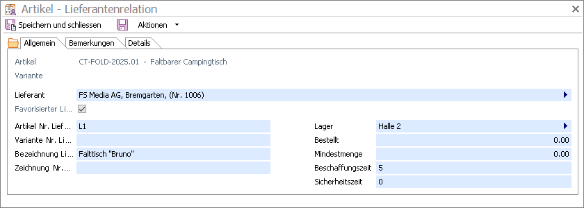 Beispielsweise kann so für jeden Artikel (oder Variante) eine lieferantenspezifische Artikel- und Variantennummer sowie Bezeichnungen und Artikelbeschreibungen hinterlegt werden. Die hier eingetragenen Lieferantenrelationen werden an Stelle der generell geltenden Werte in Artikelzeilen von Einkaufsdokumenten angewendet, in denen die betr. Adresse als Dokumentadresse eingetragen ist.