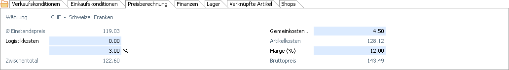 Die Preisberechnung bietet Unterstützung bei der Kalkulation des Verkaufspreises. Ausgehend vom durchschnittlichen Einstandspreis, von Faktoren für Logistik- und Gemeinkosten sowie einer angestrebten Marge kann ein kalkulierter Verkaufspreis ermittelt werden.