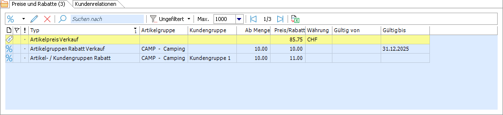 Dieses Subregister dient der Verwaltung der Preise und Rabatte im Verkauf in verschiedenen Währungen sowie für alle oder nur bestimmte Kunden. Folgende Einträge sind hier unterstützt.