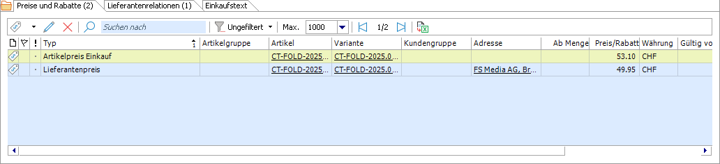Dieses Subregister dient der Verwaltung der Preise und Rabatte im Einkauf in verschiedenen Währungen sowie für alle oder nur bestimmte Lieferanten. Folgende Einträge sind hier unterstützt.