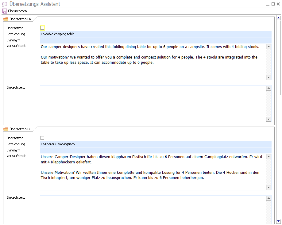 Werden die Artikeldetails von Alfred geöffnet und bearbeitet, so werden ihm die Deutsche Bezeichnung und Beschreibung in den dafür vorgesehenen Feldern angezeigt. Für Bob sind in den gleichen Feldern die Texte in Englisch sichtbar. Beide Benutzer bearbeiten die Texte in ihrer jeweiligen Sprache und speichern diese in den dafür vorgesehenen, sprachabhängigen Feldern des Übersetzungsassistenten. Wenn nun Alfred oder Bob der Haustechnik AG ein Angebot für den Faltbaren Campingtisch stellen, so werden sie feststellen, dass die Felder Bezeichnung und Beschreibung der Artikelzeile im Angebot leer bleiben. Grund dafür ist, dass für die Korrespondenzsprache Französisch des Kunden noch keine Übersetzung dieser Feldinhalte existiert. |
