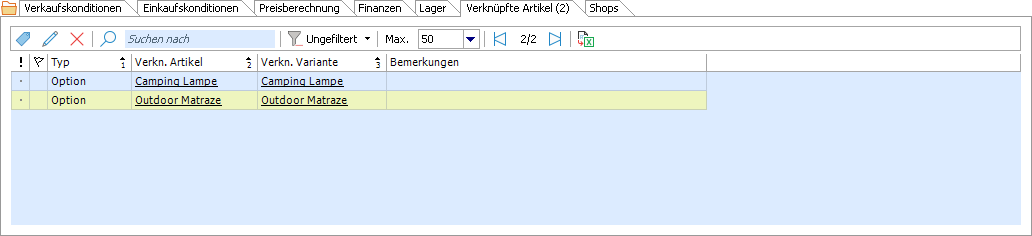 In diesem Register können Referenzen zu anderen Artikeln oder Varianten gepflegt werden. Als Verknüpfungstypen sind standardmässig Alternative, Ersatz, Nachvolger, Vorgänger und Option vorgesehen. Weitere Typen können bei Bedarf durch den Winoffice Support angelegt werden.
