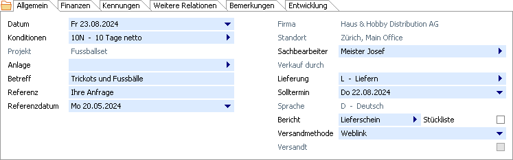 Bitte beachten Sie Die in der Abbildung in grauer Schrift dargestellten, inaktiven Felder können nur bearbeitet werden, so lange für der Lieferschein noch keine Positionen erfasst sind. |