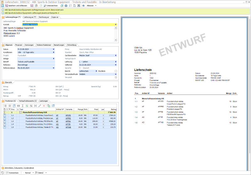Das Objektdetail besteht aus einem Bearbeitungsbereich (links) und einem Vorschaupanel (rechts). Das Vorschaupanel kann mit Klick auf die Schaltfläche in der linken oberen Ecke des Fensters aus- und eingeblendet werden. Mit Hilfe einer Benutzereinstellung kann auch bestimmt werden, ob das Vorschaupanel beim Öffnen eines Verkaufsdokuments standardmässig immer aktiv oder inaktiv ist.