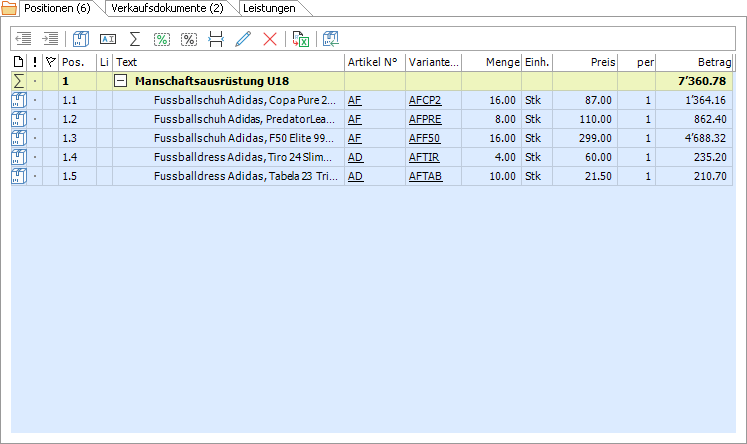 Ausgewählte Zeile einrücken - Rückt eine Position ein. Auf diese Weise können zum Beispiel Artikelpositionen in eine Zwischensumme eingerückt werden. Die ähnliche Schaltfläche mit dem nach links gerichteten Pfeil dient dem Ausrücken von Positionen. Mit dem Ein- und Ausrücken verbunden ist auch die Nummerierung der jeweiligen Position. Diese wird in der Spalte Pos. der Tabelle angezeigt. |