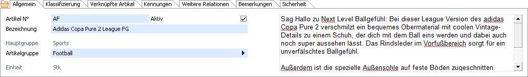 Diese Felder dienen der Klassierung des Variantenartikels. Die hier zur Auswahl stehenden Werte können in den Stammdaten verwaltet werden. Die Hauptgruppe selbst kann nicht aktiv ausgewählt werden, sondern wird durch die Wahl der Artikelgruppe bestimmt. |