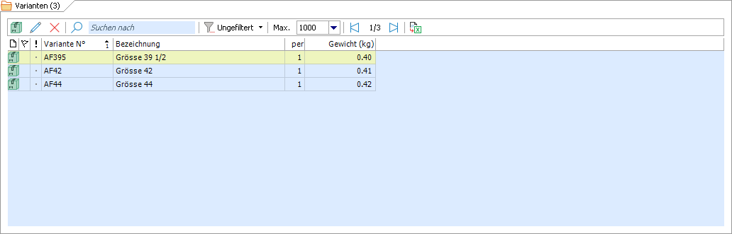 In dieser Tabelle können die Artikelvarianten (auch Varianten genannt) neu erstellt und bearbeitet werden. Alle im Portal vorhandenen Varianten sind auch in der Ansicht Varianten einseh- und bearbeitbar.