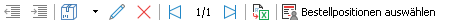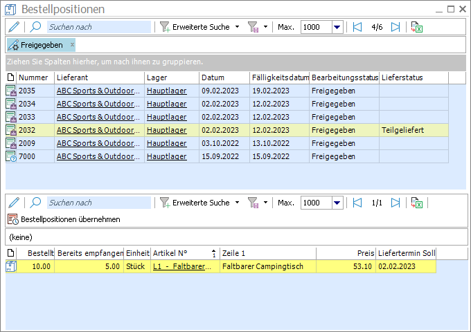 Öffnet die Auswahl aller Artikelzeilen aus Bestellungen beim Rechnungssteller. Für die Anzeige der bereits gelieferten Bestellpositionen kann in der Erweiterten Suche der Filter Abgeschlossen aktiviert werden.