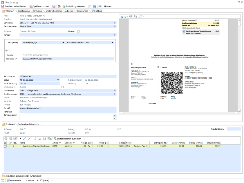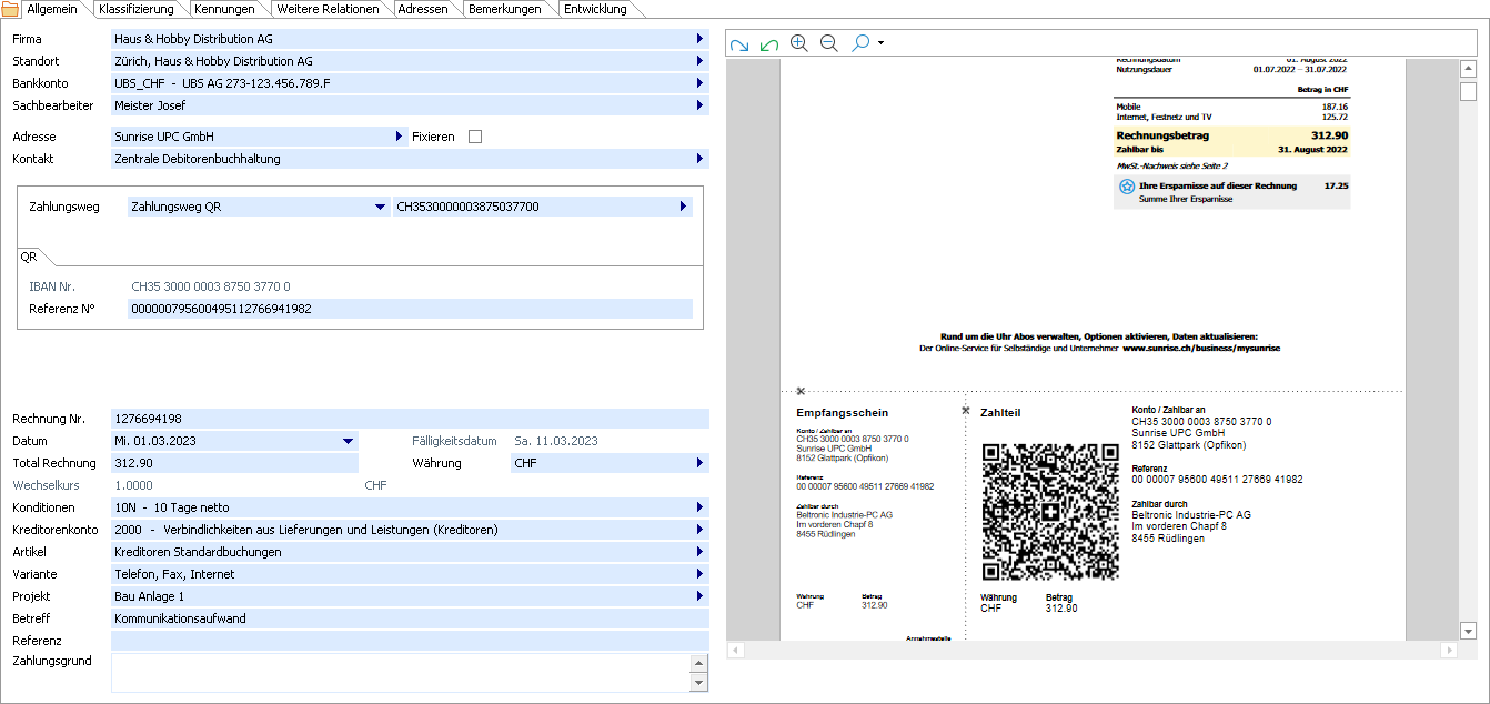 Stimmen die im QR Assistenten angezeigten Informationen mit jenen auf der Rechnung überein, können die Werte mit Klick auf OK in die Kreditorenrechnung übernommen werden.