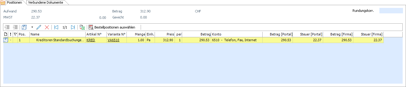 Im oberen Teil des Containers wird der Aufwand (Total der kontierten Beträge exkl. Vorsteuer in Dokumentwährung), die MWST (Summe der kontierten Vorsteuerbeträge), der Betrag (Dokumenttotal inkl. Steuer in Dokumentwährung) sowie das Gewicht (Gesamtgewicht aller Artikelzeilen) summiert und in den dafür vorgesehenen Feldern angezeigt.