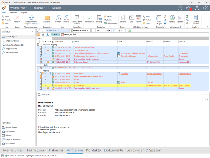 Die Ansicht Meine Aufgaben zeigt alle selbst erfassten oder von anderen Anwendern zugewiesenen Aufgaben, in welchen der angemeldete Anwender als Zuständiger Mitarbeiter eingetragen ist. Als aktiv wird eine Aufgabe geführt, solange sie nicht den Status Abgeschlossen zugewiesen erhalten hat.
