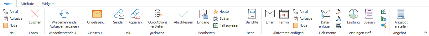 Die Aktionen der weiteren Gruppen gehören zu Standardaktionen, welche im Grossteil der Ansichten in den Prozessen Organizer, Marketing & Vertrieb, Projektmanagement, Servicemanagement sowie Handel zur Verfügung stehen. Ihre Beschreibung kann mittels Klick auf einen der untenstehenden Popup Links eingesehen werden.