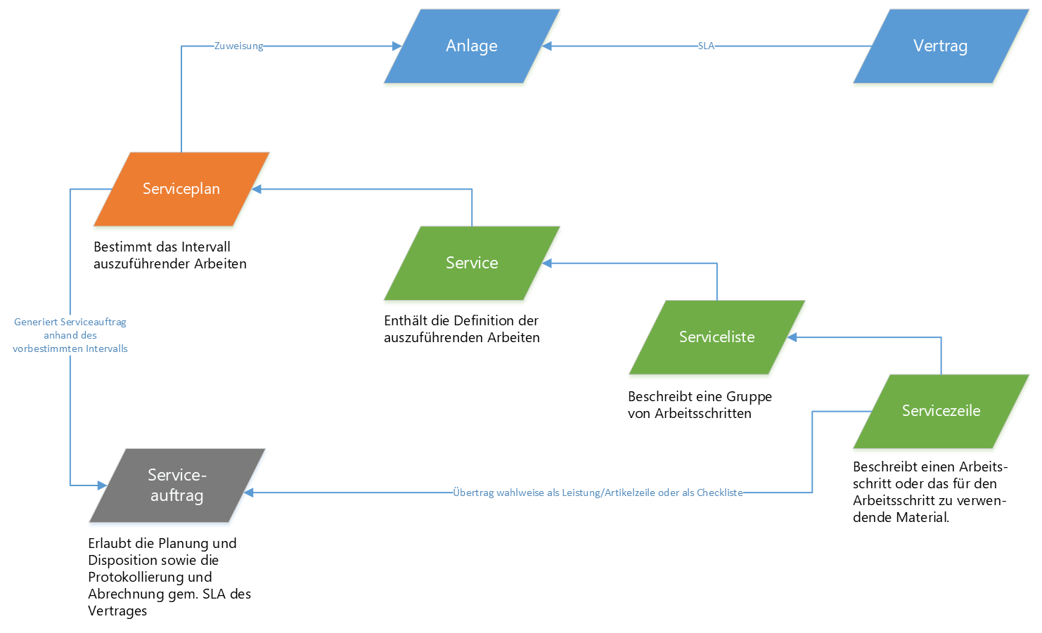 Die Abbildung bietet einen Überblick der von Winoffice Prime unterstützten Struktur für die Verwaltung und Ausführung von Servicearbeiten für Anlagen.