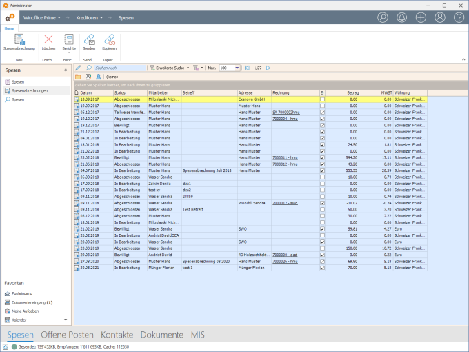Zuweilen werden erstattbare Auslagen im Rahmen der Lohnabrechnung mit dem betr. Mitarbeiter abgerechnet und ausbezahlt. Eine sachliche Bindung der Rückvergütung von effektiv angefallenen Spesen an die Lohnauszahlung besteht indes nicht. Auch wird dadurch die Anzahl der möglichen Abrechnungen und die Form der Auszahlung unnötigerweise an jene der Lohnauszahlung gebunden. Winoffice Prime unterstützt daher die von der Lohnauszahlung entkoppelte Spesenrückvergütung. Mit seinen Möglichkeiten zur automatisierten Erstellung von Zahlungsaufträgen und mit der EBICS Direktanbindung an Bankensysteme entsteht dadurch auch kein zusätzlicher Administrationsaufwand.