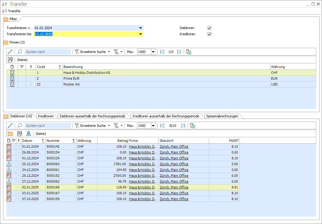 Der Transfer dient dem Überführen von Spesenabrechnungen sowie von Belegen aus den Nebenbüchern Debitoren und Kreditoren in das Hauptbuch. Dabei werden Sammelbelege im Hauptbuch generiert.