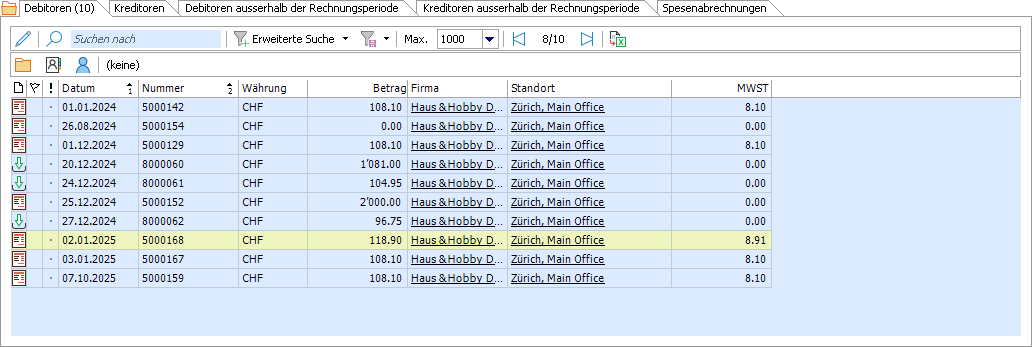 Bitte beachten Sie Sind Belege in den beiden Registern Debitoren ausserhalb der Rechnungsperiode und Kreditoren ausserhalb der Rechnungsperiode aufgeführt, ist den Gründen dafür in jedem Fall nachzugehen. Entweder handelt es sich um Belege, welche nachträglich für ein ggf. bereits abgeschlossenes Geschäftsjahr erfasst wurden oder die Belege sind auf einen Zeitraum einer zukünftigen Rechnungsperiode erfasst, für welche noch kein Eröffnungsbeleg existiert. |