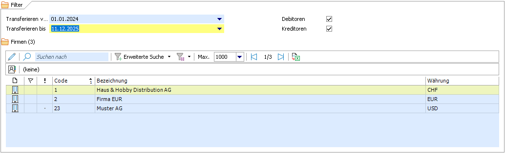 Werden in einem Winoffice Prime Portal mehrere Firmen geführt, so kann mit Hilfe der Ansicht im Container Firmen festgelegt werden, für welche Firma der Transfer stattfinden soll. Die Ansicht erlaubt auch die Auswahl mehrerer Firmen mittels Multiselect. |